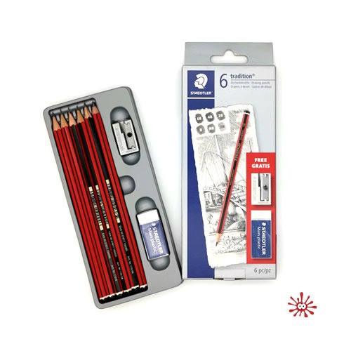 Set of 6 Staedtler tradition drawing pencils with FREE pencil sharpener & white eraser.