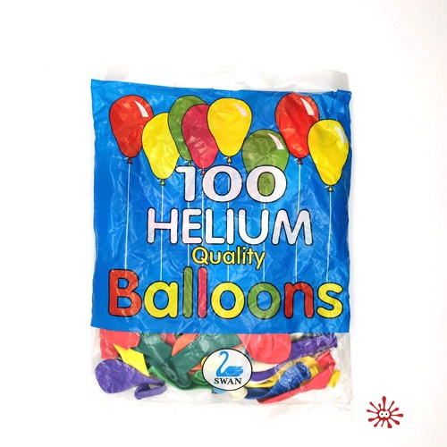 Contains 100 multi-colour round/standard party balloons. Helium quality.